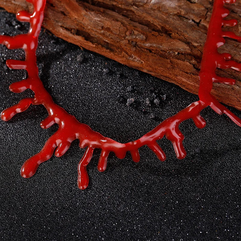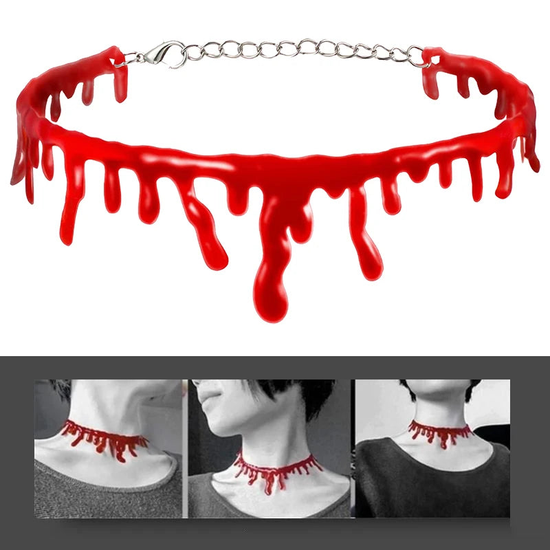 Ah, welcome, my dear. Feast your eyes upon the Bloody Choker, an exquisite piece that will make your Halloween ensemble truly unforgettable. This choker, dripping with the essence of fresh blood, is the perfect accessory for any creature of the night.