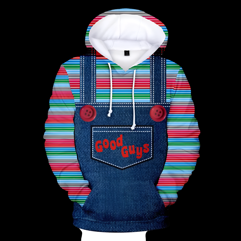 Hey there, friend! Ready to embrace your inner Good Guy? Slip into this spine-chilling Good Guy Hoodie and transform into everyone’s favorite playtime pal. Made from a cozy blend of cotton and polyester, this hoodie is perfect for those cool, eerie nights.