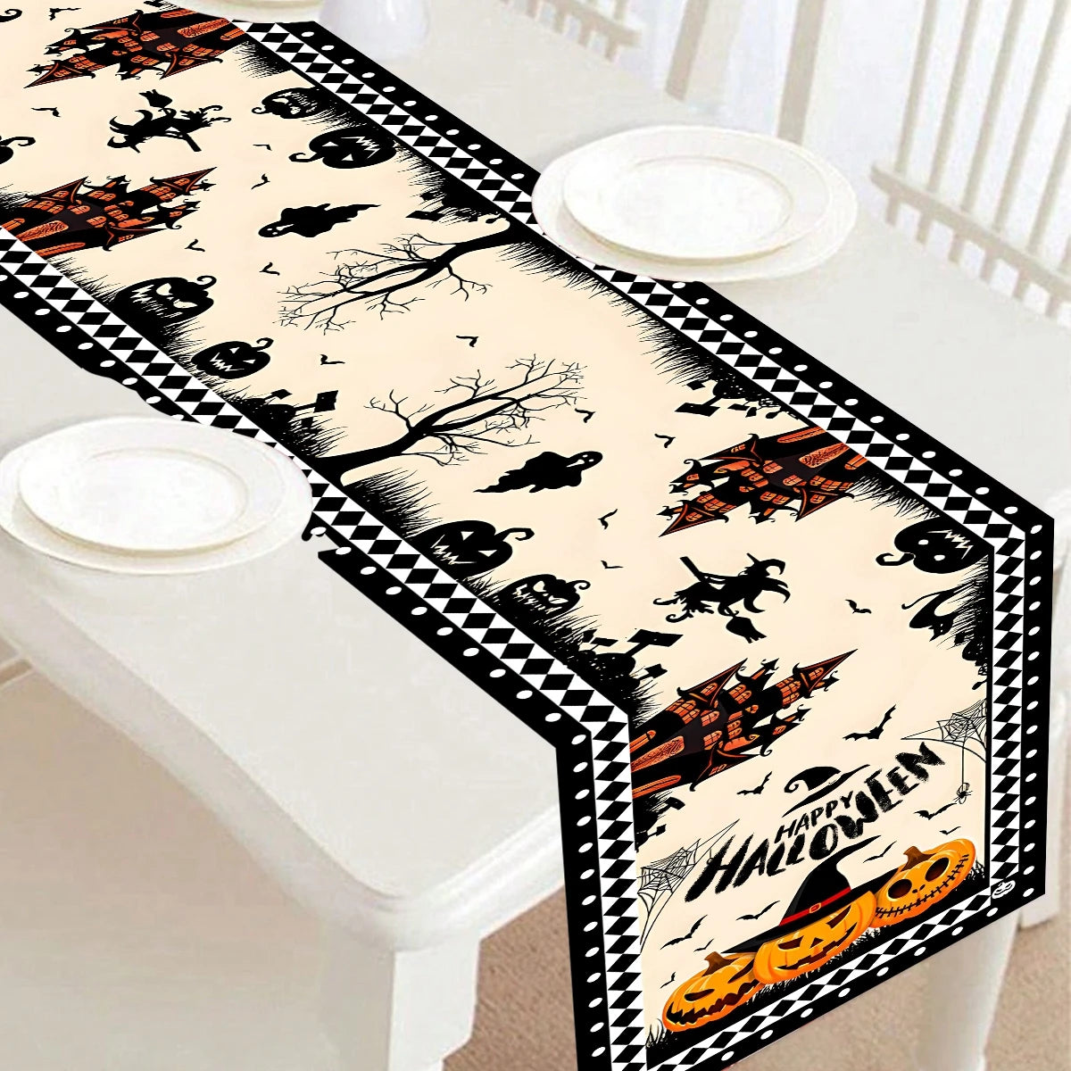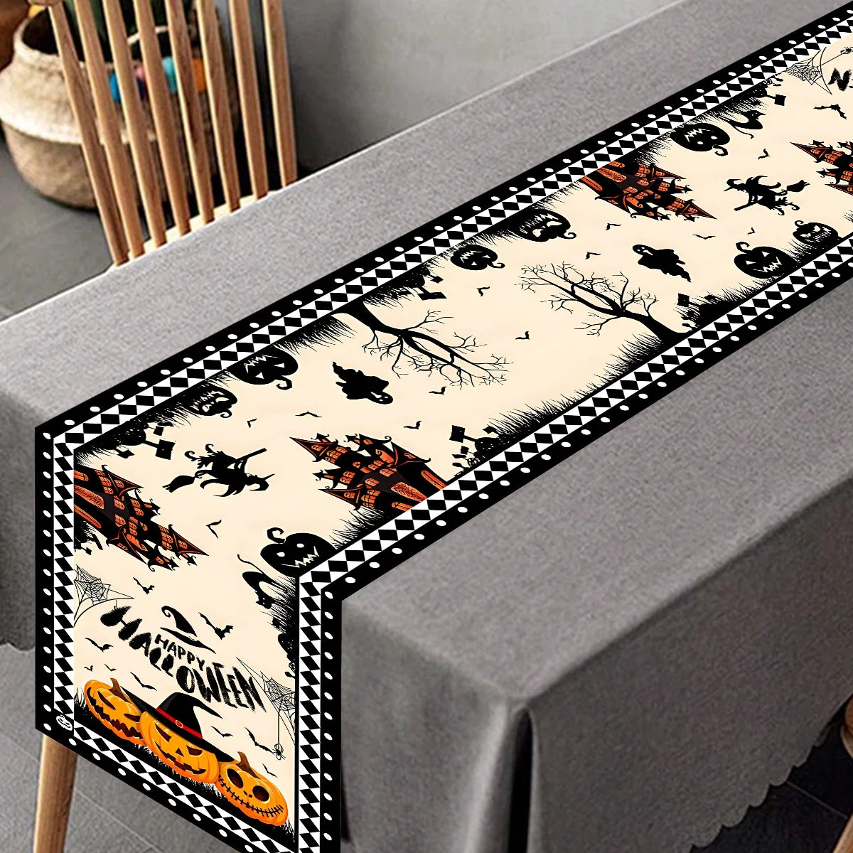 Let the Happy Halloween Table Runner be the centerpiece of your eerie celebrations, casting a spell of enchantment over your guests. Perfect for those who love to embrace the spooky season with style and flair.