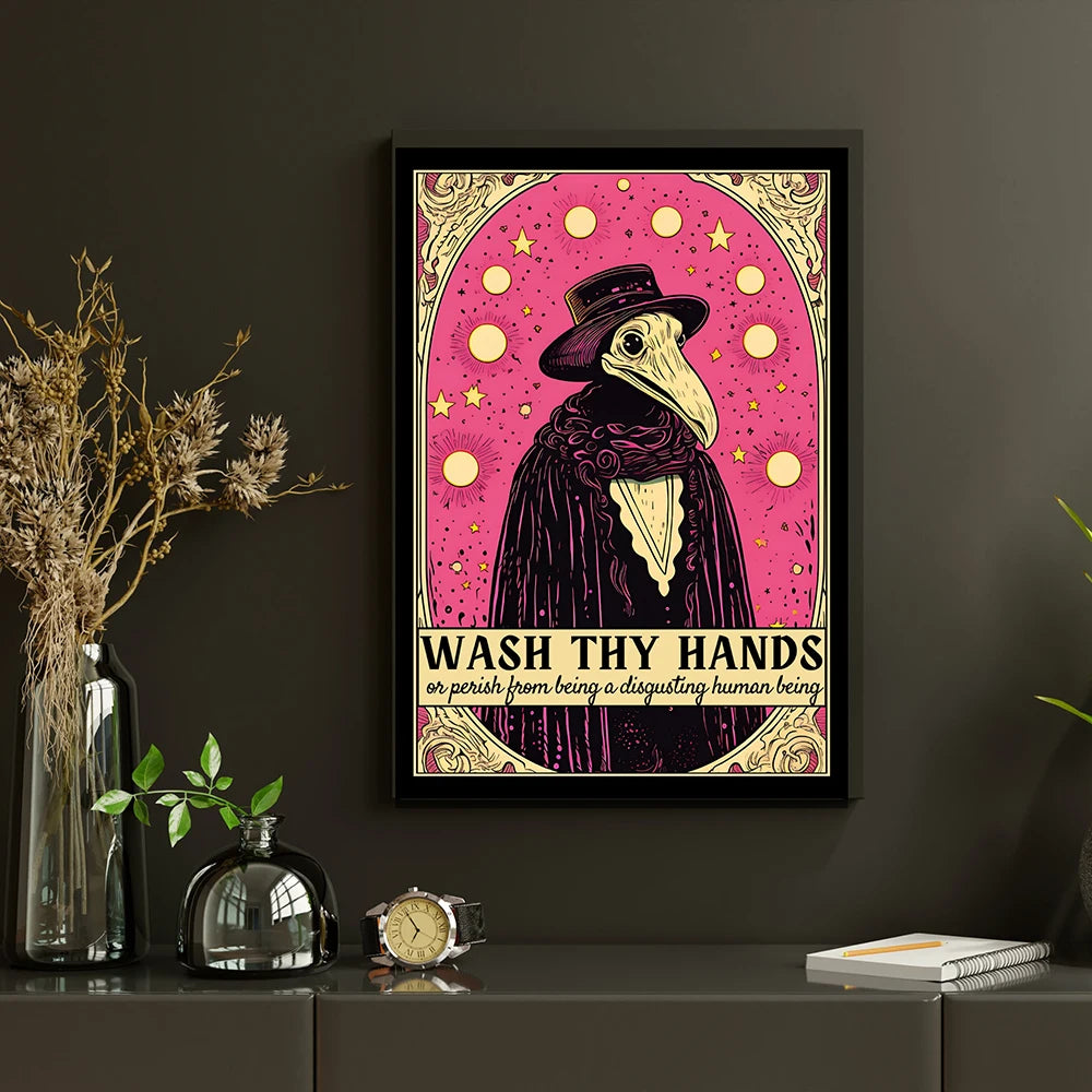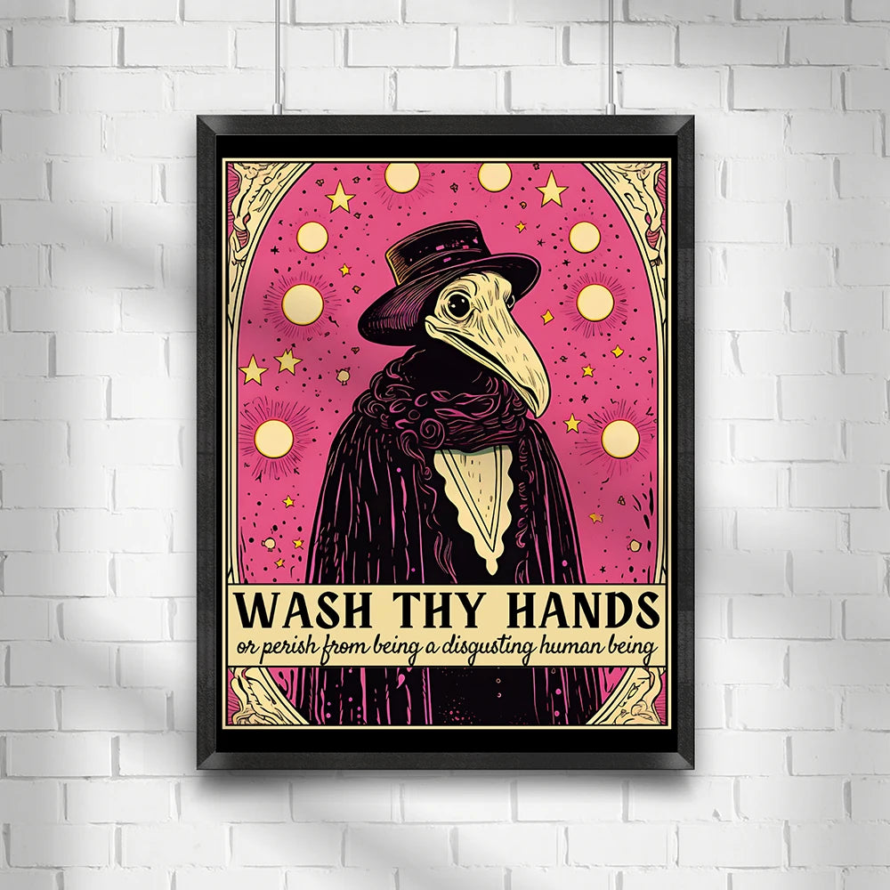 In the depths of the eerie night, when shadows dance and whispers of the unknown fill the air, the Wash Thy Hands Poster stands as a sentinel of cleanliness and protection. Crafted with the wisdom of the ages and the mystic arts of the plague doctor, this poster is not just a mere decoration but a powerful talisman against the unseen evils that lurk on your hands.